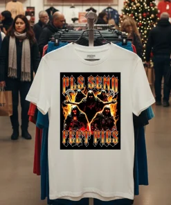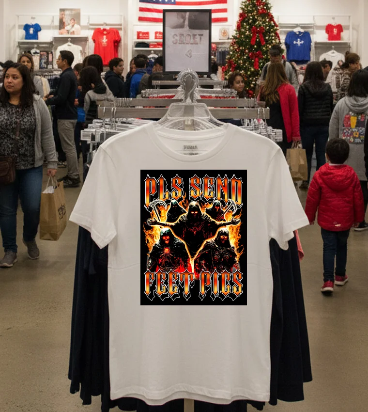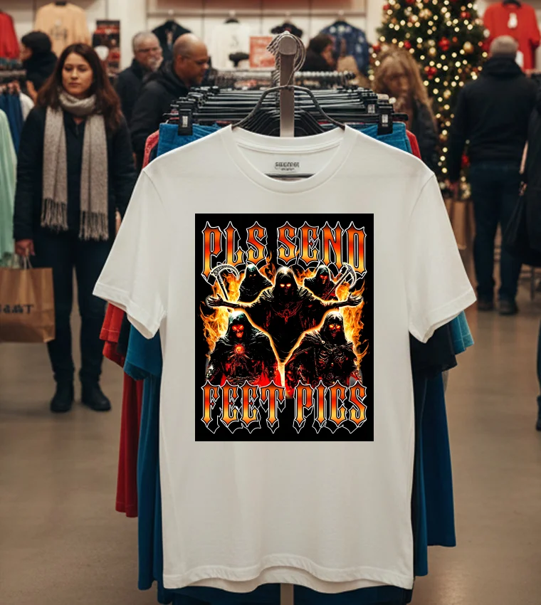 Remember that buzz a few weeks back, right after the “LA Street Style Unpacked” event? Everyone was talking about how internet culture was finally hitting mainstream fashion, blurring lines between satire and statement. I was scrolling through my feed, seeing all the celebrity stylists like Karla Welch and Jason Rembert championing bold, anti-establishment graphic tees, and then I stumbled upon a piece in Vogue about the rise of “meme-wear” – clothing that takes viral internet moments and puts them front and center. It specifically highlighted how designers were leaning into provocative, darkly humorous phrases. That’s when it clicked. I was at The Row’s new pop-up on Melrose, sipping my iced matcha, when a friend pointed out someone sporting an edgy, almost ironic graphic. “That’s the vibe!” she exclaimed, “It’s all about mixing high-low, subverting expectations, and embracing the unapologetically weird side of digital life.” She mentioned how this trend was making waves, especially with Gen Z who are defining their own aesthetic, moving away from ultra-curated perfection towards raw, authentic expression. I immediately thought of the Pls Send Feet Pics Deaths Shirt. This isn’t just a shirt; it’s a sartorial nod to the bizarre corners of the internet, a knowing wink to those who understand the humor in the absurd. It’s perfect for that L.A. art gallery opening where you want to spark a conversation, or even just chilling at a West Hollywood coffee shop, subtly broadcasting your unique sense of humor. It speaks to a crowd that appreciates the subversive, the edgy, and isn’t afraid to wear their internet-savvy on their sleeve. In a city obsessed with personal branding, this tee is a bold, unforgettable statement that resonates with the current wave of “ironic chic” taking over the Los Angeles fashion scene.