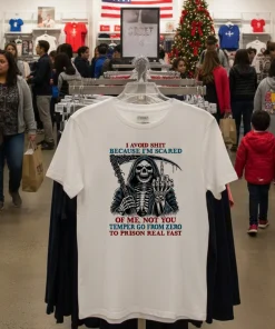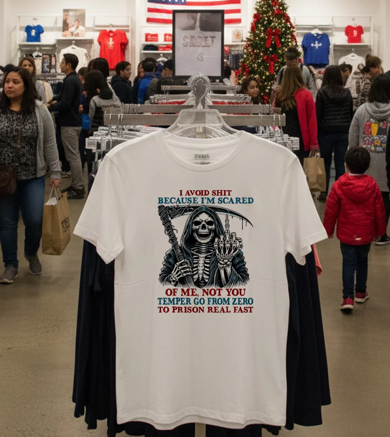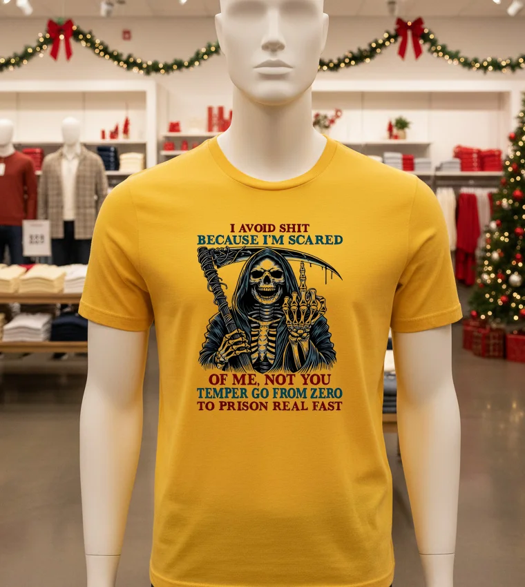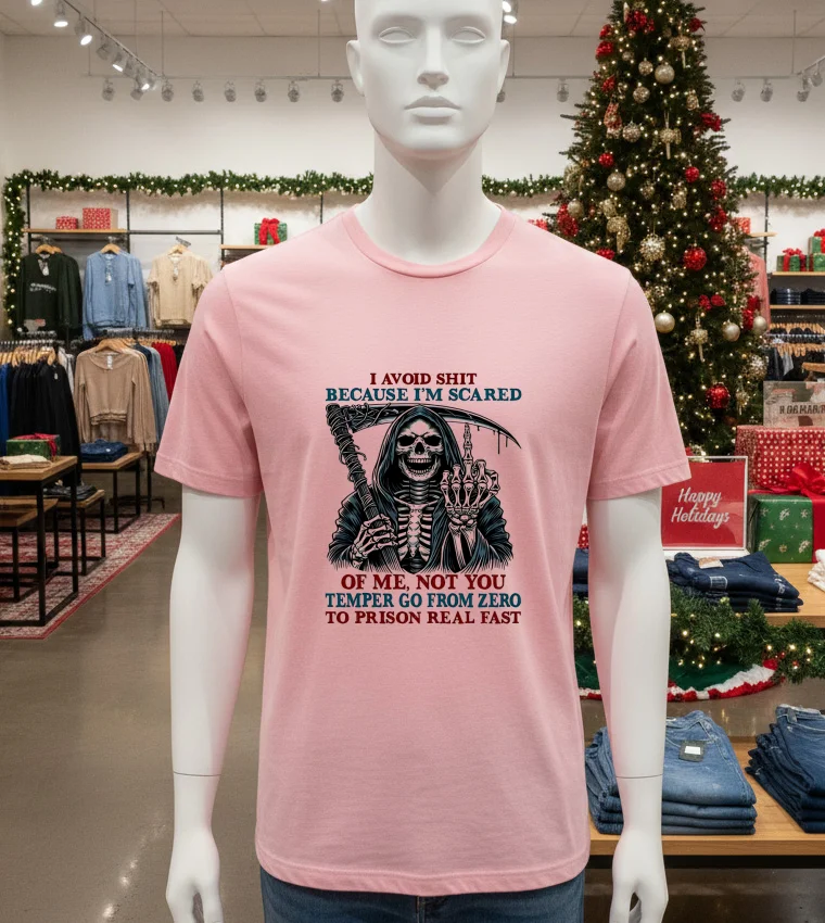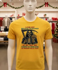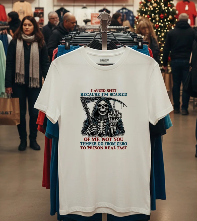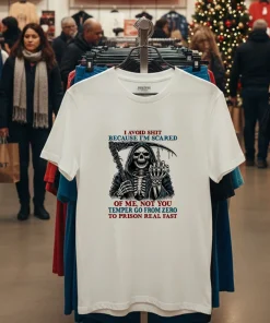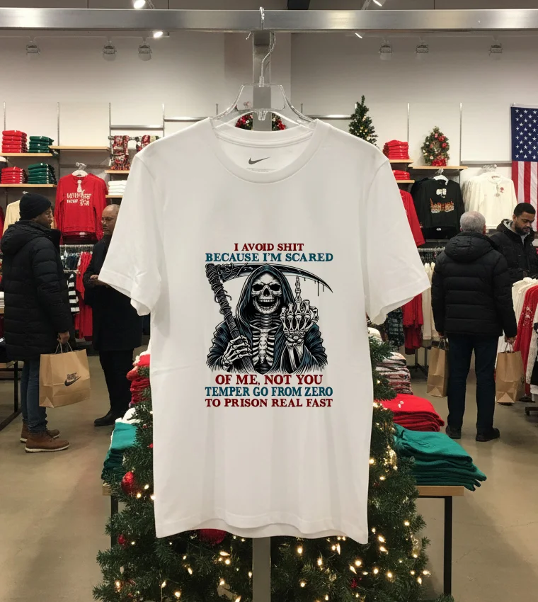 Remember that buzz last month around the Hollywood Reporter’s ‘Style Icons’ feature? Everyone was talking about how vintage graphic tees are making a massive comeback, especially here in LA, pairing them with everything from sleek leather trousers to oversized denim. It got me thinking about my friend, Mike, who works down in the Arts District. Mike’s one of those guys who always seems calm, but you know there’s a fire under the surface. He’s usually pretty chill, but if you push him too far, well, let’s just say his ‘temper’ can indeed ‘go from zero to prison real fast.’ He saw the Death Skeleton I Avoid Shit Because I M Scared Of Me Not You Temper Go From Zero To Prison Real Fast T Shirt online and just had to have it. He’d been looking for something that spoke to his unique brand of self-awareness – a little bit of humor combined with a very real, though exaggerated, warning. This tee isn’t just a shirt; it’s a profound statement, perfect for someone who navigates the bustling, often chaotic, energy of downtown LA, where self-expression is as much a currency as cryptocurrency. With the rise of ‘quiet luxury’ juxtaposed against bold, expressive streetwear dominating Melrose Avenue, this shirt fits right into the current fashion dialogue. It’s a nod to the Y2K revival we’re seeing, but with a thoroughly modern, self-deprecating twist. This isn’t just about looking good; it’s about feeling understood, especially in a city where personal brand is everything. Whether you’re hitting up a cutting-edge pop-up shop in Silver Lake, catching a new art exhibit at MOCA, or just grabbing a matcha latte in West Hollywood, this tee says it all without you having to utter a word. It’s part of the new wave of ‘aestheticcore’ where clothing tells your story, merging comfort with cutting-edge cool and a dash of satire. It embodies that laid-back yet fiercely independent spirit that defines so much of California’s contemporary style, making it an essential piece for anyone’s modern wardrobe. For Mike, it’s a daily reminder, a humorous internal monologue made external. It’s for anyone who appreciates the irony of looking tough while admitting a very human, and relatable, fear of one’s own darker side. It’s the ultimate conversation starter, or perhaps, a conversation stopper, depending on who you’re talking to! This tee is for you if you’re not afraid to own your quirks in style.