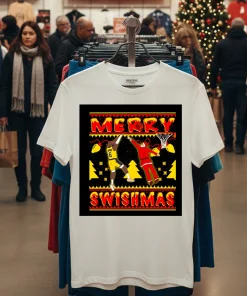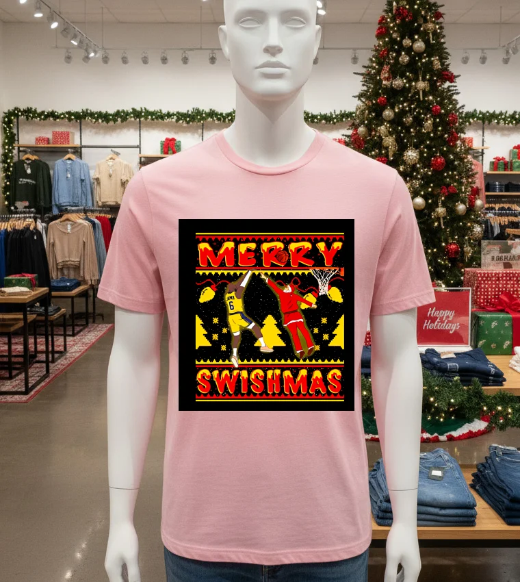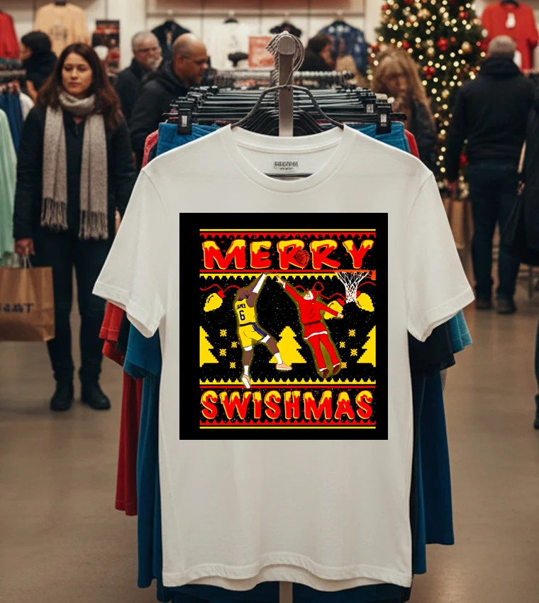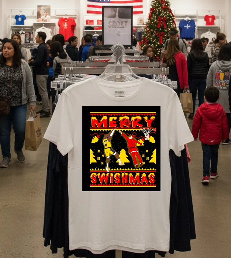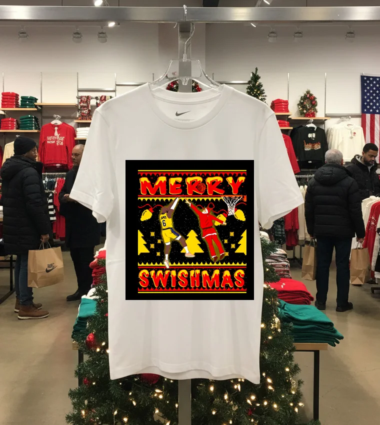 Remember that buzz a few weeks back when LeBron was spotted courtside at a high-profile L.A. fashion event, maybe not wearing this exact tee, but definitely setting a vibe that merged hoops and haute couture? It got everyone talking about how NBA stars are redefining “athleisure trends” right here in the City of Angels. That’s exactly where the Merry Swishmas Lebron James Shirt comes into its own. Picture this: It’s a crisp December evening, maybe a little chilly for L.A., and you’re heading to a casual watch party at a friend’s place in Silver Lake. The Lakers just had a stellar November, and the “Swishmas” spirit is definitely in the air. You’ve been looking forward to wearing this shirt, feeling that buzz of game night. Earlier in the day, you saw an Instagram story from a local influencer, showing off their “vintage graphic tee” collection, talking about how “street style” is all about expressing your passions. This tee isn’t just about showing love for King James; it’s about tapping into that distinctly L.A. fusion of sports fanaticism, casual cool, and a touch of holiday whimsy. It’s perfect for cheering on the Lakers, hitting up a festive pop-up shop on Melrose, or just grabbing a coffee while soaking in that unique West Coast “fashion-forward” energy that seems to permeate every sidewalk. It’s more than just a shirt; it’s a statement about your love for the game and your place in the city’s vibrant culture, truly embodying the “LA casual chic” vibe that’s dominating searches for “current fashion trends.”